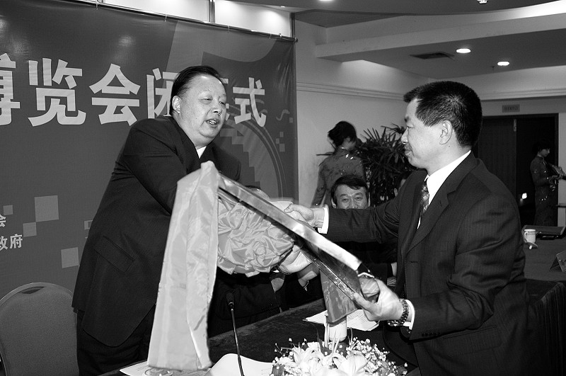 为进一步做大做强农产品物流配送,打响当地农业品牌,台州市黄岩区在全省率先成立了农产品营销管理中心。在12月5日举行的2007浙江农博会闭幕式上,副省长茅临生(左一)向黄岩区农业局局长顾士良授牌。