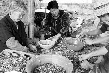 近日,玉环县龙溪乡梅岙村渔民陈水仁一家,围在一起正在挑选跳跳鱼(弹涂鱼)。他告诉笔者,这些跳跳鱼是用矮小网扦插在海涂上,待潮水退时捕获的,每天捕获15公斤,收入600元左右。 吴达夫 摄