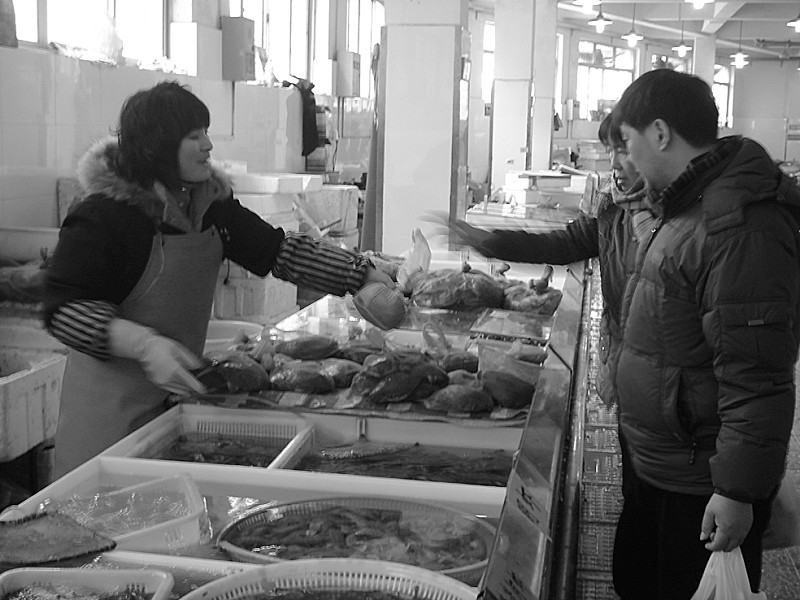 而在经销户眼里,今年的虾市并不景气。一位姓陈的经销户告诉笔者,就明虾而言,年前也不过十多块一斤,现在降到7块一斤也无人问津。“年前下了雪,虾相对好卖一些,尤其到了除夕前两天,价格很高,销量也很好,但却很难拿到货。”据陈老板介绍,二十九那日,因为他来得晚了一些,就没有拿到货。而交通顺畅之后,各类虾又大量上市,造成了市场的积压。“以前要过了正月十五生意才会清淡少起来,可今年正月初八就没什么顾客了。市场上的虾比往年都多。”他边说还边向前一指,旁边这一路的摊位都是卖虾的。