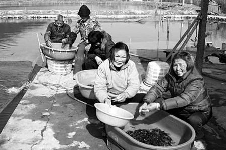 绍兴县富盛镇义峰村养虾大户许国民,抓住今年春节河虾俏销的有利时机,每天早上破冰捕虾,从大年三十到正月初十,共出售河虾1700多公斤,进账15万多元。图为帮工们在挑选河虾。王水根 摄