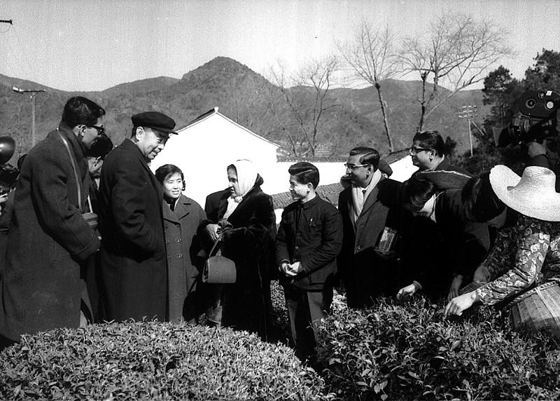 周总理(左二)陪同锡兰贵宾参观杭州梅家坞茶园。