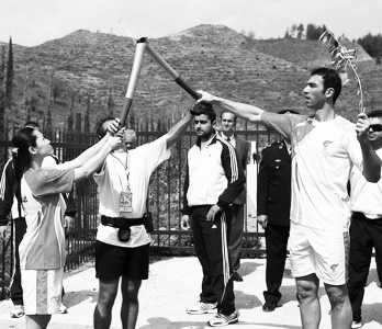 3月24日,北京奥运会圣火传递第一名火炬手、希腊跆拳道运动员亚历山大·尼克拉泽斯(右)在火炬传递中,与中国火炬手罗雪娟进行交接。 新华社记者 毕明明 摄