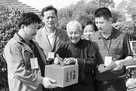 日前,德清县乾元镇联星村101岁的吴妹林老人在家门口投票选“村官”。 小绍兴 摄