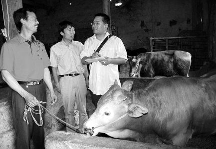 衢州市柯城区日前出台扶持政策,凡该区华墅乡低收入农户从事生态养殖等,都可获得1-4万元贷款,利息全部由市、区财政承担,以扶持低收入群体奔小康。图为该区航埠信用社工作人员正在低收入农户家中调查用贴息贷款发展肉牛养殖的有关情况。 吴铁鸣 王建洪 郑建龙 摄
