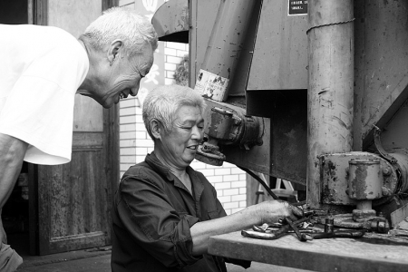 江山市贺村镇农机修理老师傅陈祥海,具有40多年维修保养农机具的丰富经验,经他维修的拖拉机、耕田机、收割机等大小农机具超过1万台。图为陈祥海正在保养一台收割机。 祝日耀 摄