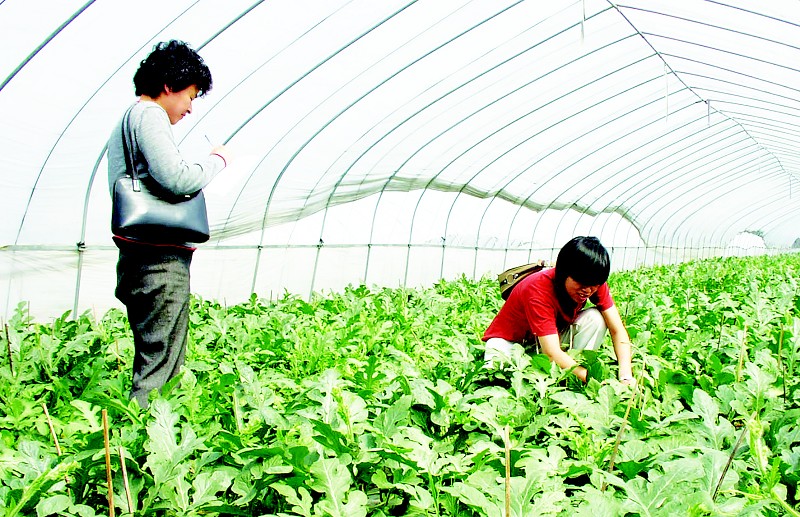 图为平湖市农技人员正在金平湖西瓜合作社基地查看西瓜长势情况。