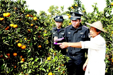 眼下,正是桔子成熟时节。台州市公安局黄岩分局的民警主动来到辖区内的桔园,全力维护桔园治安。图为民警正在向桔农了解治安情况。