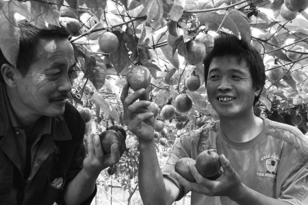 玉环县芦浦镇井头村村民吴存美引种的2亩大棚百香果藤蔓挂满果实,预计可采摘百香果2500公斤,按每公斤18元计算,收入4万多元;他培育的200多株果苗,每株也卖出了30元。图为吴存美(右)正在采摘果子。 吴达夫 摄