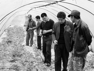 傅跃进(右二)在田间向农户传授大棚西瓜种植技术
