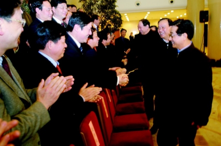 2月10日下午,赵洪祝(右一)、吕祖善(右二)、周国富(右三)等省领导会见了2008年度我省新农村建设优秀市和优秀单位、“低收入农户奔小康工程”结对帮扶先进单位、粮食生产先进市县代表和农村工作指导员、科技特派员工作先进单位和个人。本报记者袁 卫 摄