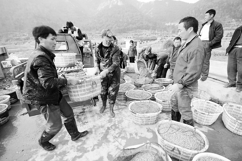 三门县今年蛏苗产销两旺。全县共养殖蛏苗3.5万亩,亩产近200公斤,总产值将超过千万元。图为三门浬浦镇草头村村民们正在搬运蛏苗,准备销往江苏等地。