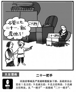 河南省郸城县严重超职数配备干部。县政府办公室有1名主任、9名副主任、8名主任科员、3名副主任科员,从“一把手”一直排到“二十一把手”。