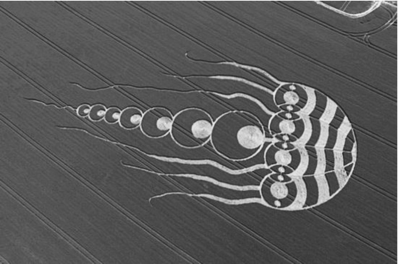 日前,英国牛津郡附近的一个麦田里又出现了长约600英尺 (约合183米)、水母形状的麦田怪圈,让许多人惊叹不已。