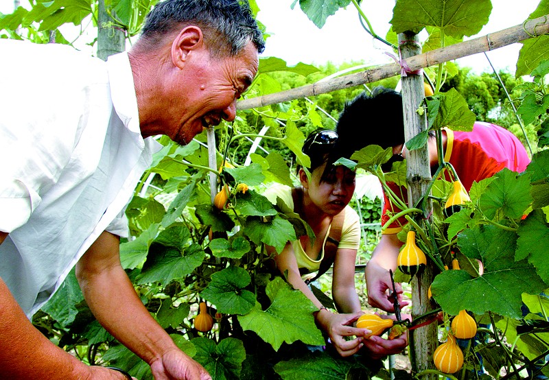 近日,在衢州市柯城区七里乡上村村500米长的蔬菜观光长廊里,砍瓜,金童南瓜、佛手、葫芦、黄瓜,以及长达1.8米的丝瓜等,迎来了一批又一批游客。吴铁鸣 摄