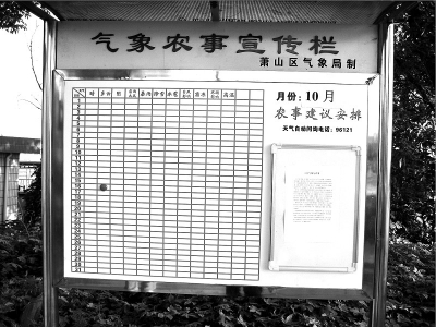 为使气象零距离服务 农 业 生产,日前,萧山区气象局在头蓬区农科所蔬菜生产基地设置了天气信息宣传栏,及时发布近期天气变化信息和农事操作建议,为广大菜农享受气象服务搭建了一个良好平台。