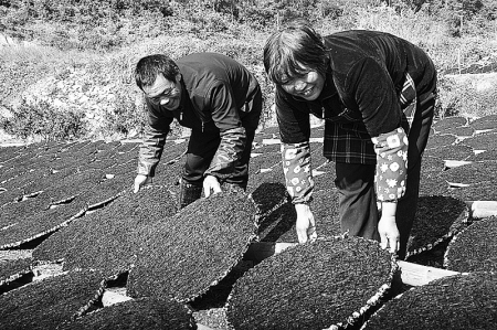 眼下正值紫菜开采时节,三门县的许多养殖户趁着晴好天气,纷纷翻晒紫菜,呈现一派丰收景象。据悉,今年三门养殖紫菜5000余亩,预计亩收入可达5000元左右。图为12月6日该县浬浦镇金岙村村民陈良购夫妇正在翻晒紫菜。