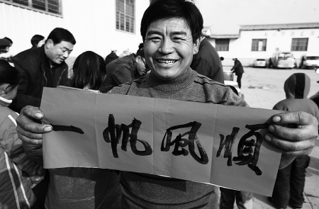 春联送祝福,喜气进万家。舟山市开展的“红红春联送留守民工”活动,让留守民工的心里乐开了花,每个人脸上都洋溢着幸福的笑容。 胡社友 摄