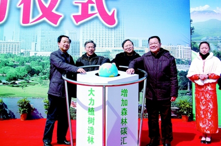 3月10日,宁波市委常委、鄞州区委书记寿永年(左二)等区领导共同按下启动钮,正式启动了“森林鄞州”建设。 程益新 摄
