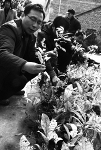 衢州市柯城区调整造林树种结构,改变以往单纯种植针叶林树种,导致生态效益不好、水土保护不强、病虫害防治较难以及易发生森林火灾等缺陷。今年,山上新栽树苗大部分改为苦槠等彩色阔叶林树种,山下大量种植锦绣黄桃、枇杷等果树,在绿化的同时,提高农民的经济收入。图为林技人员正在检查树苗。吴铁鸣吕明亮 摄