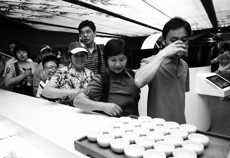 图为游客在浙江馆内喝上龙井茶。 梁臻 摄