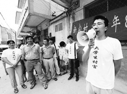 他叫张浩,28岁,土生土长的江苏南京杨庄村村民。日前,这个奋斗在城市里的“80后”放弃干了5年、年薪10万元的民营公司主管职位,竞聘家乡村主任。张浩为宣传自己,建了网站,还专门花上千元做了后援团广告衫,自己骑着摩托车在5个投票点演讲,派发自我推荐的宣传册子。(摘自《扬子晚报》 2010年6月20日)