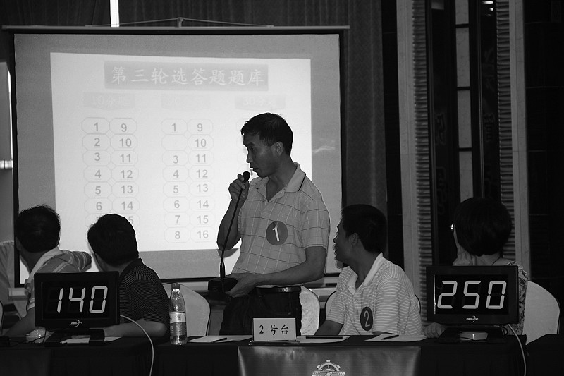 日前,杭州市《农业机械监督管理条例》及监理业务知识竞赛决赛在杭举行,由该市各区(县、市)农机部门组成的8支代表队进行了角逐。经过队员必答、代表队选答、集体抢答三个环节,最终,富阳市农机监理所夺得桂冠。图为富阳代表队成员在现场答题。 本报记者 俞廷尚 摄