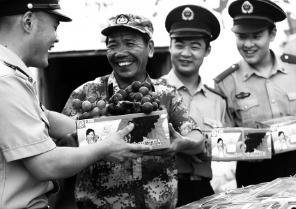 台州金清镇勤劳村伤残军人黄小林自1984年退伍后,自强自立,在家乡创办的“海丰”葡萄种植基地,今年光葡萄一项年产值就近300万元。7月22日,他专程来到台州边防支队黄琅边防派出所,为驻地官兵送葡萄,并向他们传授葡萄种植技术。