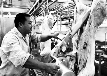 我省首条从荷兰引进的生猪屠宰自动化流水线日前在义乌华统集团投入运行,该流水线刺杀放血、褪毛吊挂、去头去蹄、开膛扒脏、开剖分割、秤重编号、检疫盖章等工序全部自动化作业,每小时能屠宰生猪620头。图为工人正在流水线上进行开剖分割作业。 张建成 摄