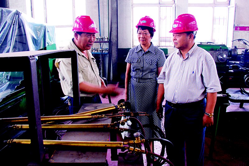 徐在山(左一)正在为来访的客商介绍公司情况。在庆祝55年厂庆上,徐在山(右一)为杰出人物颁奖。