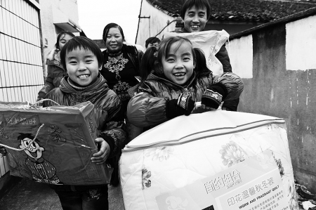 1月26日,留在余姚市泗门镇过年的贵州外来务工人员杨应红一家,拿到了镇里送来的春节慰问品。
