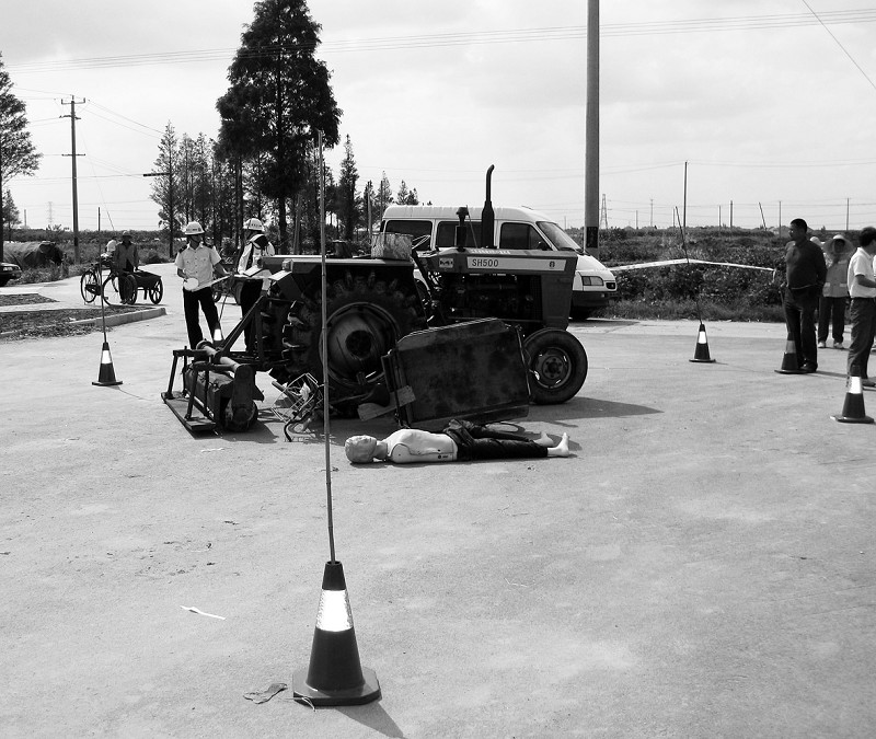 一般农机事故:是指造成3人以下死亡,或者10人以下重伤,或者1000万元以下直接经济损失的事故。事故处理演练