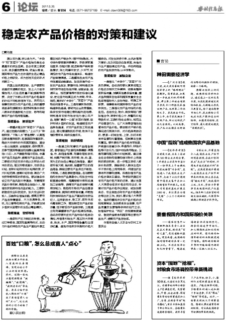 ——国家信息中心预测部相关负责人近日发表文章说,粮价是“百价之基”,是控通胀的基础。现实来看,我国粮价相对国际粮价具有一定独立性。不过在经济全球化的背景下,随着我国粮食供求结构变化、粮食价格逐步市场化,加之预期效应和比价效应的作用,国内粮价和国际粮价的关联程度趋于增强。国际粮价维持升势仍可能给国内粮价带来一定输入性压力。