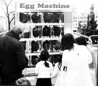日前德国法兰克福市中心出现了一台奇特的自动贩卖机,里面装的是一只只活蹦乱跳的母鸡,但它卖的不是鸡,而是鸡蛋。格子里一共有16只母鸡,它们生的鸡蛋都存在自动贩卖机内,你投币即可得到对应母鸡的鸡蛋。
