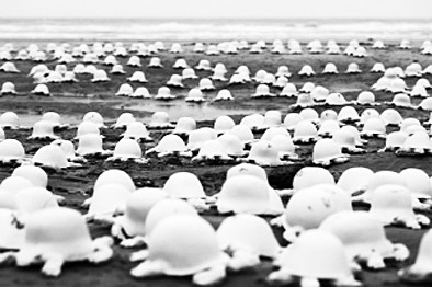法国西部奥马哈海滩举行诺曼底登陆纪念日前夕,法国艺术家创作了1000只海龟模样的二战时期作战头盔摆满海滩,意为呼吁人们反对全球暴力。 (摘自《新民晚报》 2011年6月7日)