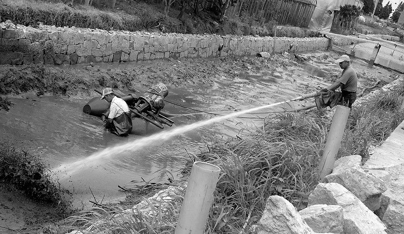 连日高温,为防止旱情到来,6月28日,温岭市滨海镇的有关工作人员正忙着用泥浆泵吸灌河道淤泥,提高河道抗旱蓄水能力。