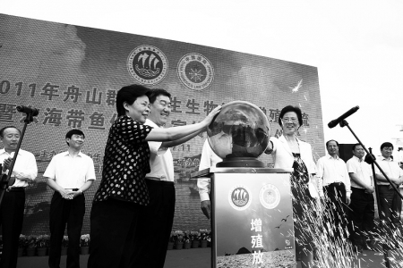牛盾(前左二)、葛慧君(前左一)等共同启动2011年舟山群岛水生生物资源增殖放流宣传活动。
