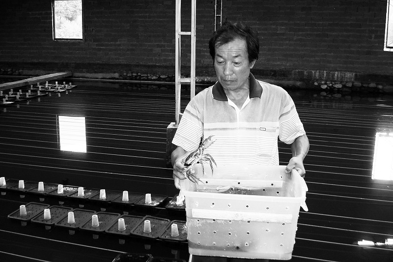三门青蟹一直以来都是采用粗放型的综合养殖模式,因青蟹天生喜斗,成活率极低,产量和效益呈逐年下降趋势。目前,三门三特渔业公司采用“一蟹一笼”的笼养模式,大大提高了青蟹成活率,亩产量可提高30多倍。图为技术人员正在将蟹装笼。