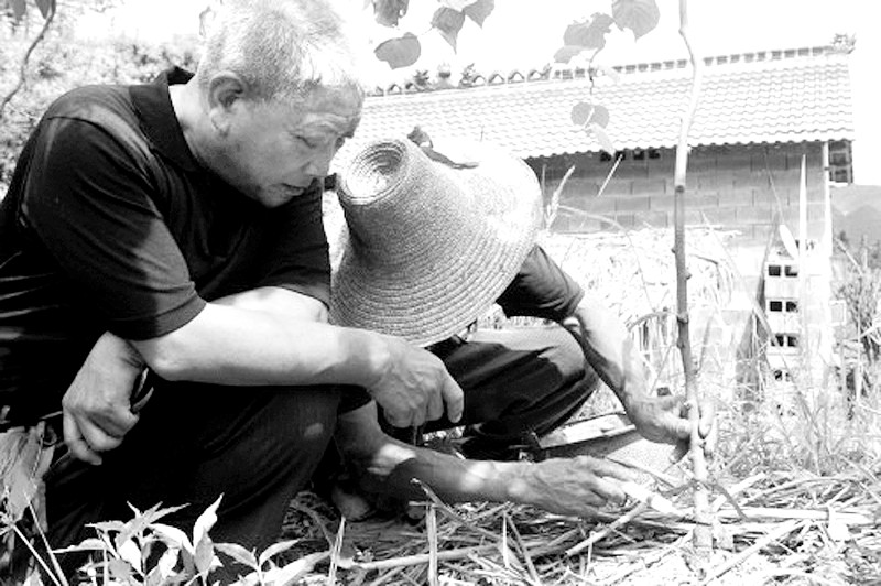 江山市退休农艺师姜干云,对猕猴桃情有独钟,潜心研究打针治虫新技术,专治蛀心虫(透翅蛾幼虫)。图为姜干云(左一)在廿八都镇花桥村龙井坑猕猴桃园中指导打针治虫,药针打进树干后,虫在5秒钟内爬出树干毙命,能收到立竿见影的效果。