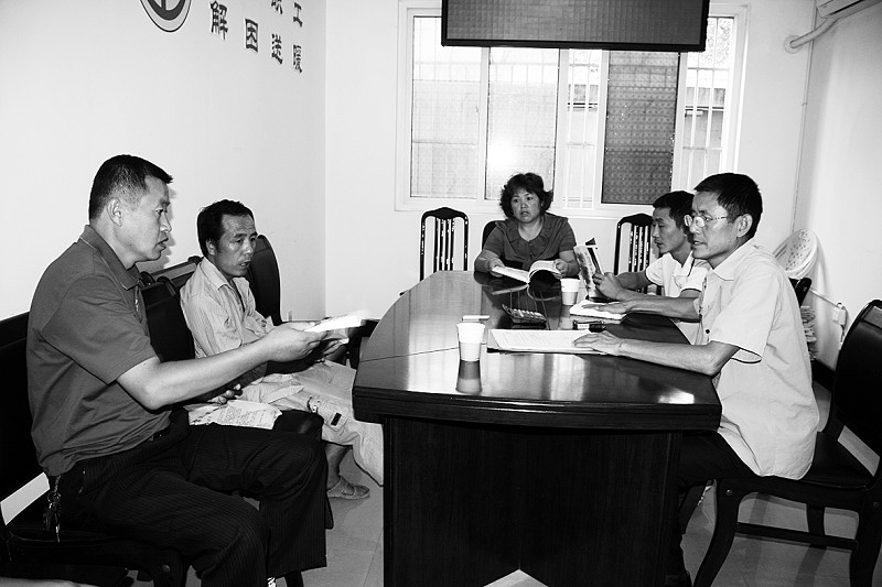 “张书记,你说得有理,我听你的。”9月5日下午,在舟山市普陀区沈家门街道大蒲湾社区新居民维权中心调解室里,大蒲湾社区暂住居民党支部书记张文球正与安徽籍农民工张成谈话,就工伤赔偿事宜和其解释沟通。自去年以来,张文球(右一)已成功调解维权案例50余起,已到位的维权赔偿金达200余万元。