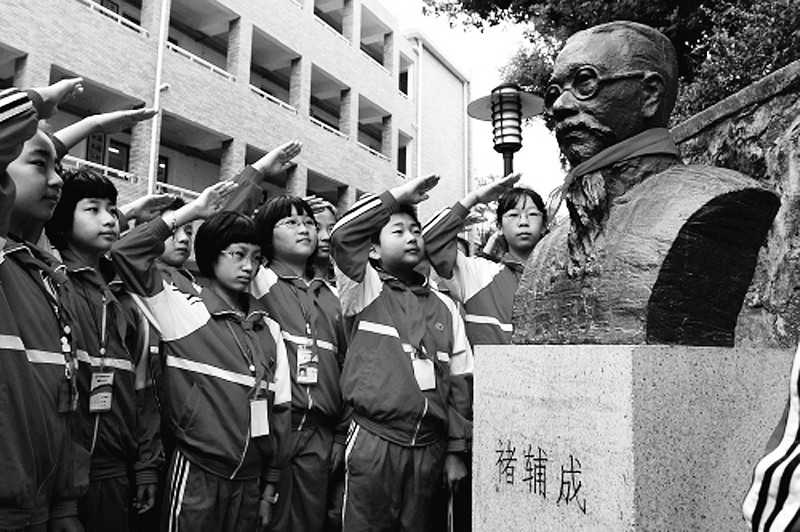 嘉兴市辅成教育集团的学生们在校史教育中,了解到该校创始人褚辅成先生就是辛亥革命的积极参与者,倍感自豪。10月9日上午,同学们来到褚辅成先生的塑像前,为他佩戴上了红领巾,向这位伟大的革命先驱致敬,并致以少先队员最崇高的敬礼。