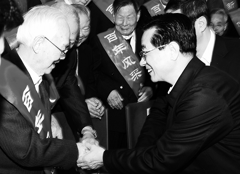 庆祝大会开始前,省委书记赵洪祝(右)亲切接见了省农科院“百年风采人物”、“科技新秀人物”和“优秀团队”。 本报记者 叶敏 摄