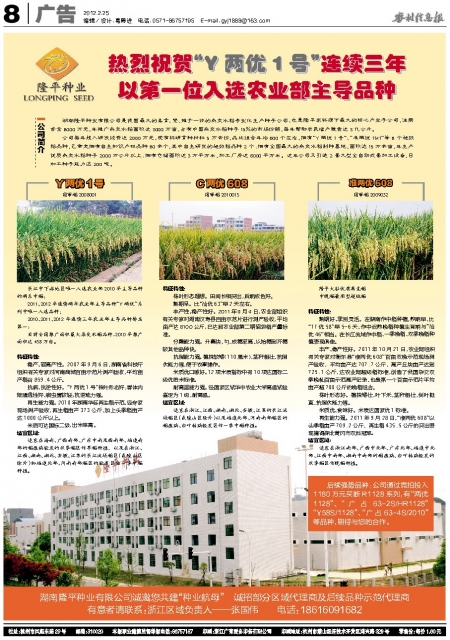 ·热烈祝贺“Y两优1号”连续三年以第一位入选农业部主导品种