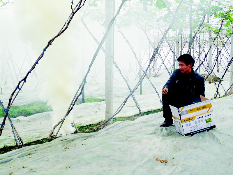 前段时间,连续低温多雨天气,日照少,园地湿度大,导致葡萄灰霉病旺发。图为温岭市民康果业有限公司的员工,正在用烟雾剂熏杀防治葡萄灰霉病。 应明友 摄