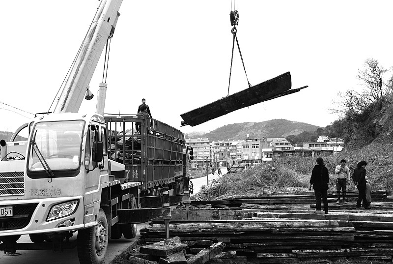 近日,在温岭市城南镇长沙村,吊车将老船木吊起装运到大卡车上,准备运往广东。从事老船木贩运的老杨说,老船木主要用做个性家具与室内装饰,销往福建、广东等地后,制成家具,出口欧美。料好的老船木从几年前的2000多元/吨涨至5000元/吨。老船木以它独具魅力的残缺美与沧桑美,成为收藏家与家装业追逐的对象,也因其稀缺性引来了投资客的关注。(老船木,是废弃船只用料的总称,包括坤甸、柚木、榆木、菠萝格、铁梨木等,品质较好的这类木材制造的渔船使用寿命可长达百年,而一般的渔船使用年限仅为65年。) 葛云丹 摄
