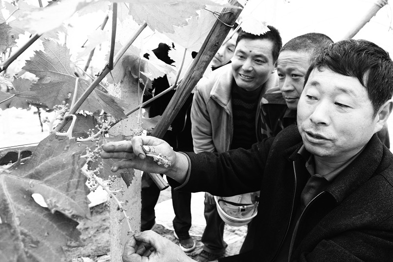 4月10日,义乌市葡萄种植能手王维平(右一)在义亭镇杭畴村自已的葡萄园里,手把手向葡萄种植户们做葡萄穗拉长示范。 仁 视 摄