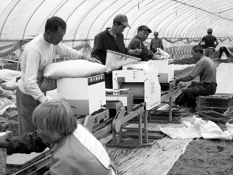 笔者在现场看到,第一个社员先在履带上放入塑料盘,第二个社员加上育秧基质,第三个社员在育秧盘里装入早稻种子,第四个社员再覆盖一层育秧基质,第五个社员整理好育秧盘,最后负责搬运育秧盘的社员把育秧盘放在铺有塑料薄膜的地上,育秧流水作业就完成了。“加上后勤服务的社员,两条生产线一共用了17名员工。”杨灯聪说,由于基质中富含秧苗生长所需的氮、磷、钾等有效成份,以及杀菌剂等农药,加工育秧盘不再像黄泥加工时需要配上农药、化肥等进行人工搅拌,因此,省了不少劳动力,加上采用基质比较轻,育秧不再像过去一样必须在合作社驻地生产,可直接在田间地头生产,少了不少运输费用,“整个算下来,基质育秧成本和黄泥育秧成本差不多。”
