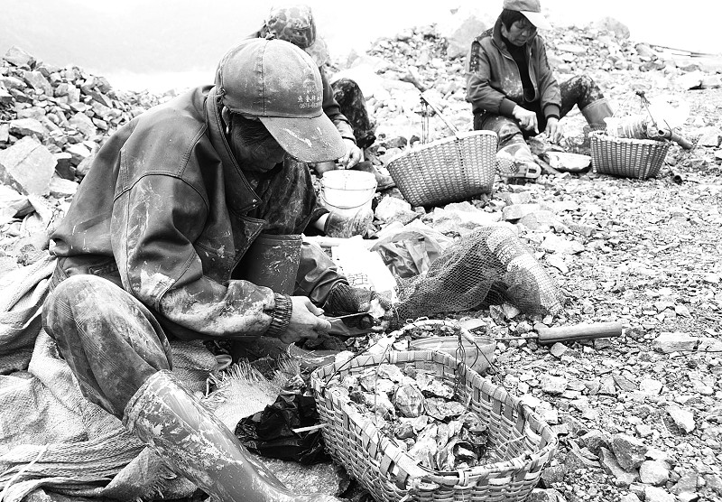 4月 12日上午,温岭市城南镇担屿塘围涂工程附近,几名妇女在采收野生牡蛎。据悉,牡蛎有清热益阴、软坚化痰、治疗失眠等功效,是高营养的海产品。当天,这些妇女采收的牡蛎以每公斤60元的价格出售。