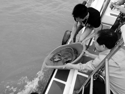 浙江渔政工作人员正在放生中华鲟。