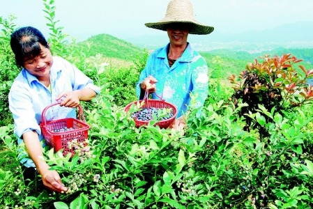 连日来,在建德市下涯镇马目村200多亩平坡生态果园里,10多位妇女在采摘蓝莓,蓝莓日产量达200多公斤,价格每公斤 160-200元。据果园负责人邵贤红介绍,今年蓝莓总产量预计可达2万多公斤,产值200多万元。