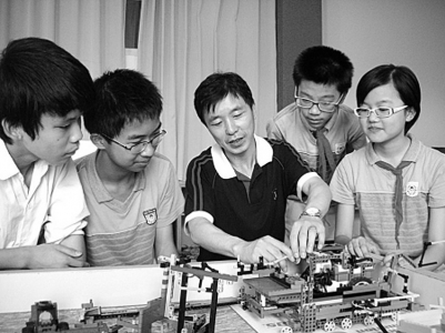 近日,代表中国队征战2012FLL机器人世锦赛的宁波北仑东海实验学校师生一行15人从德国凯旋归来。在40个国家、68支参赛队伍中,他们脱颖而出,继去年美国世锦赛夺得金奖后,再次勇夺金奖。图为辅导老师(中)和载誉归来的学生一起总结此次比赛得失。